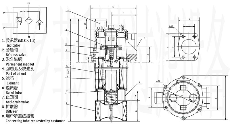 8、具有安裝連接及更換濾芯方便的特點(diǎn):進(jìn)油口為法蘭連接,對(duì)于濾頭與油箱安裝法蘭,用戶可按圖表中尺寸在油箱板上設(shè)計(jì)并加工6只法蘭螺孔即可。旋開過濾器頂蓋可更換濾芯或向油箱內(nèi)加油。